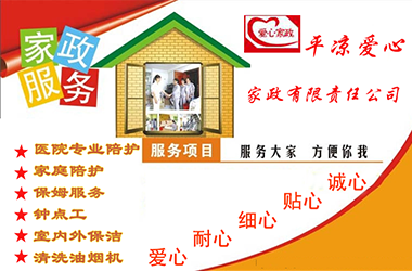平涼市愛心家政有限責任公司成立于2007年1月,2007年5月掛牌,在平涼市工商局注冊登記。是一家有償服務機構,主要服務項目有:醫院專業陪護、家庭專業陪護、保姆、鐘點工、室內外保潔 。